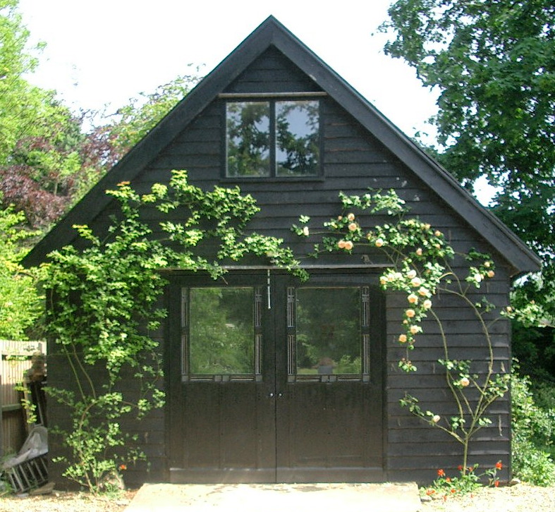 This timber framed building acts as a summerhouse and garden room. The glass doors and windows are furnished with stained glass panels. | ![]() |